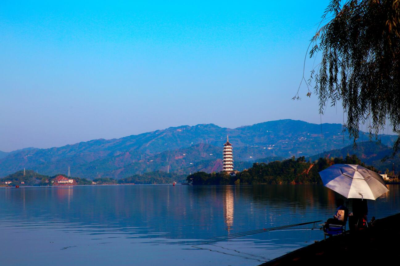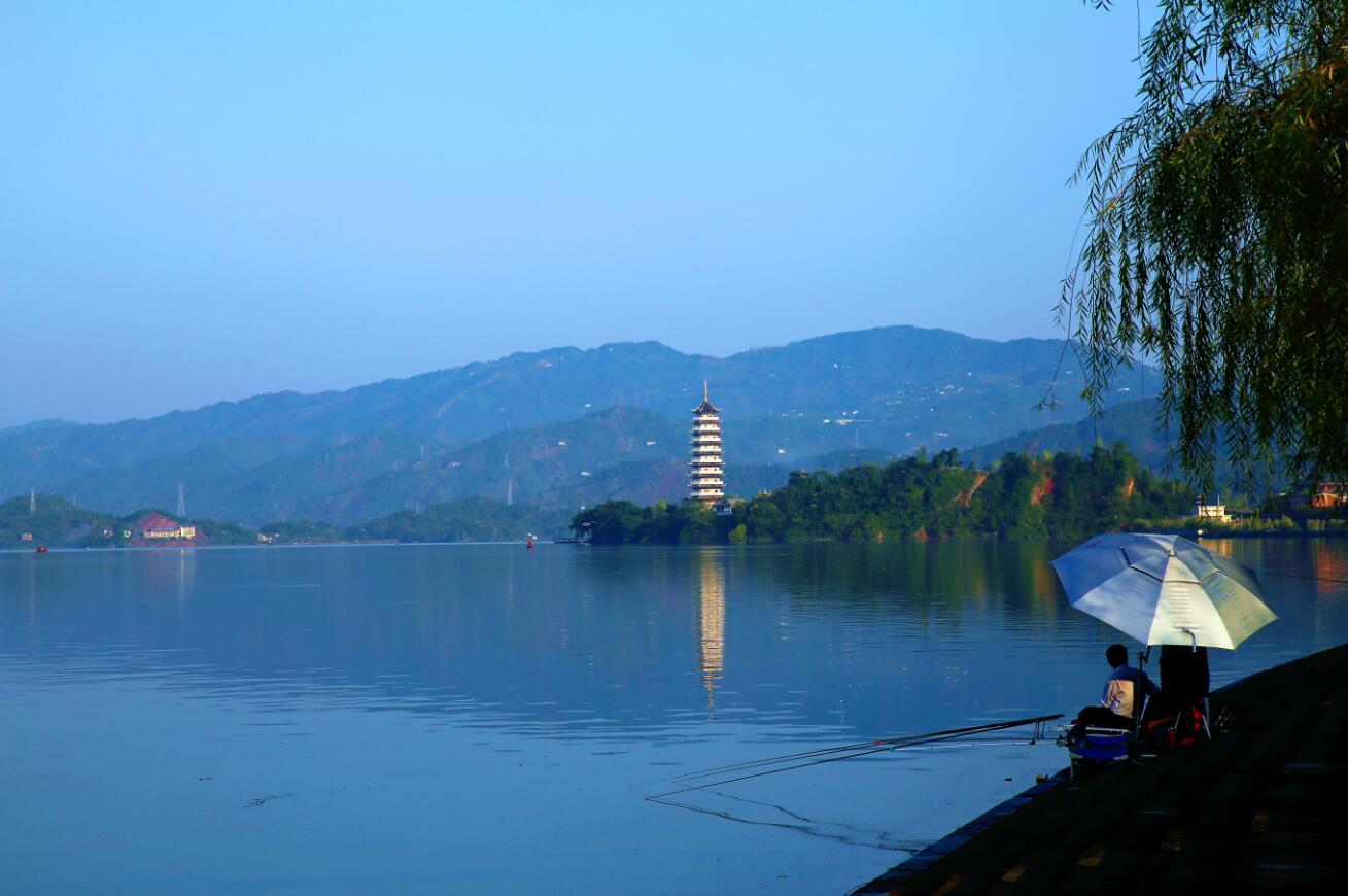夕阳西下,汉丰湖边垂钓别有一番味道